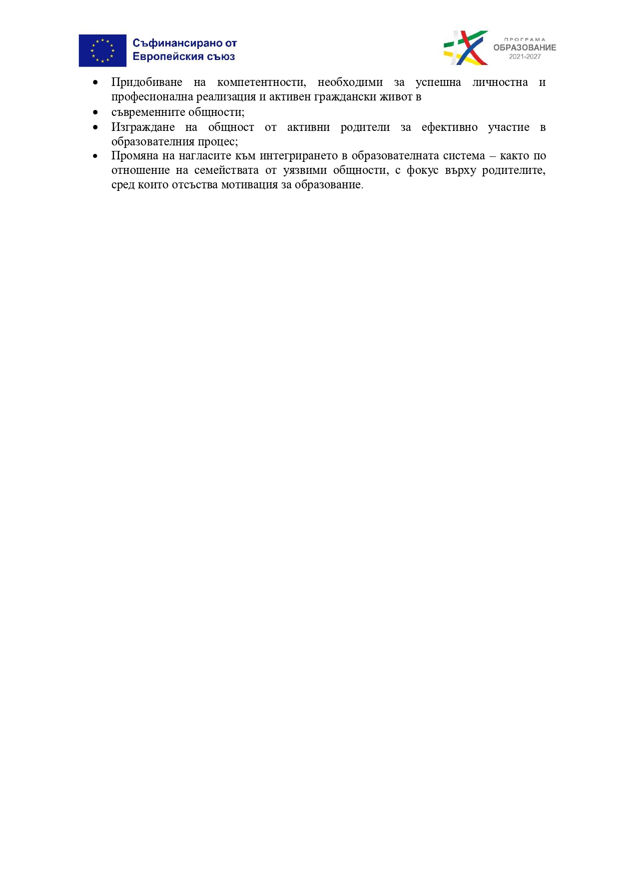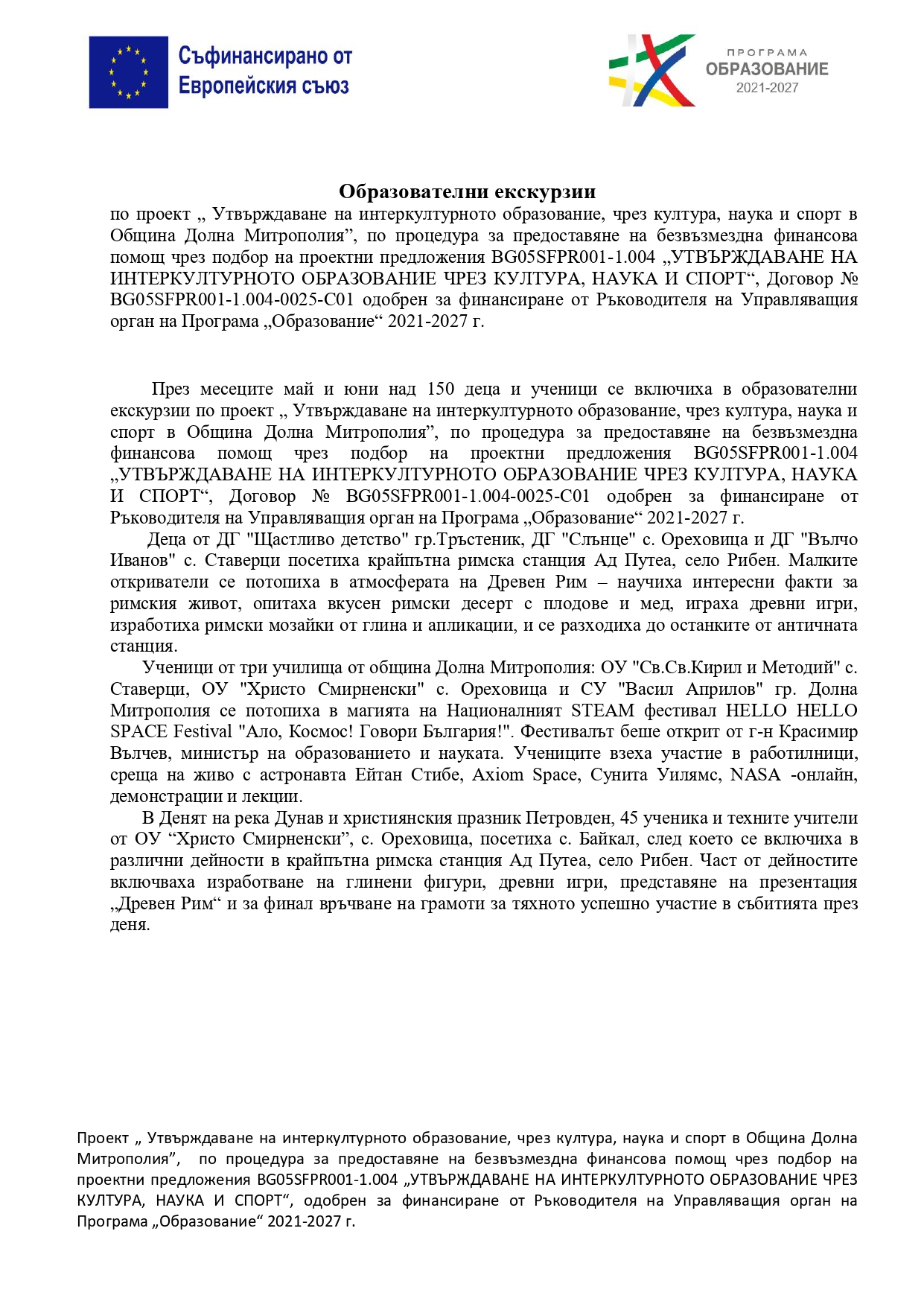 Проект „Утвърждаване на интеркултурното образование, чрез култура, наука и спорт в Община Долна Митрополия" с Договор № BG05SFPR001-1.004-0025-C01, финансиран по Оперативна програма „Образование" 2021-2027“, приоритет 1 „Приобщаващо образование и образователна интеграция“, процедура №BG05SFPR001-1.004 „Утвърждаване на интеркултурното образование чрез култура,наука и спорт“.