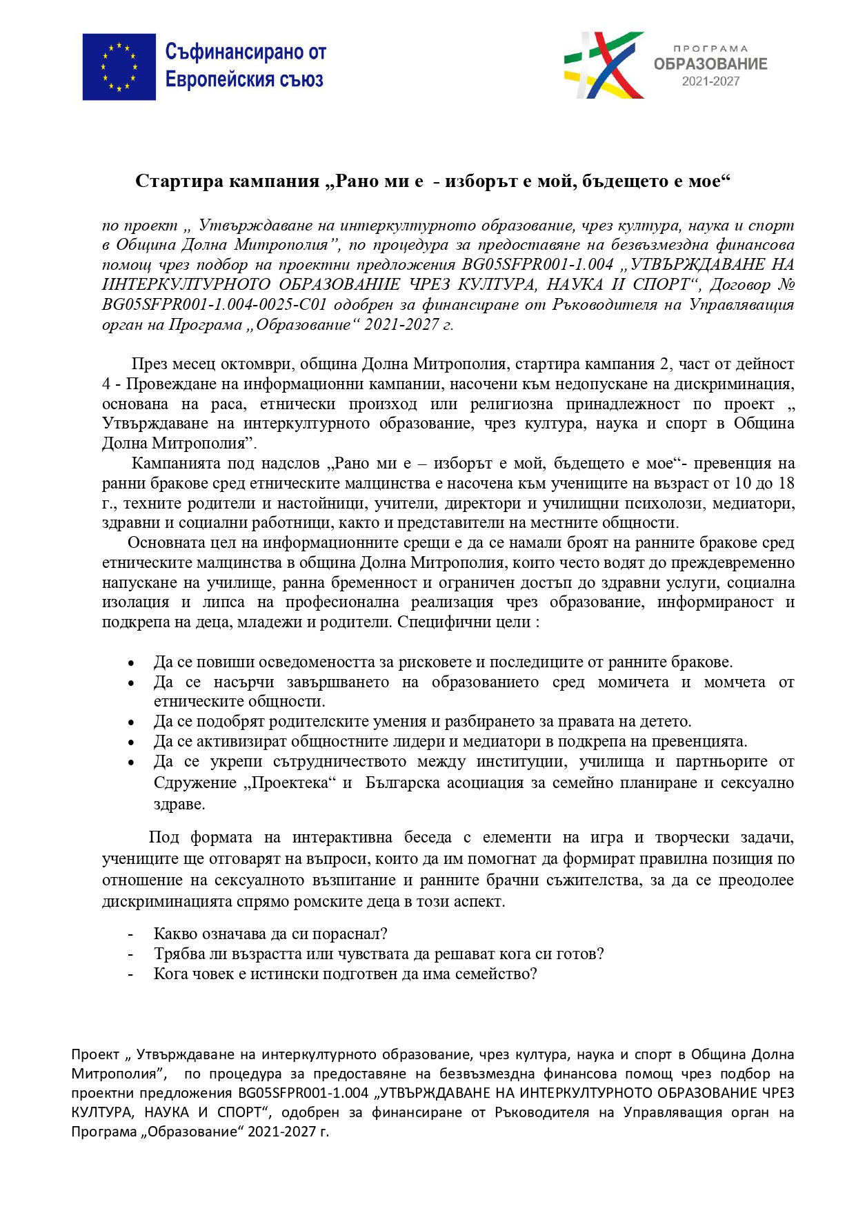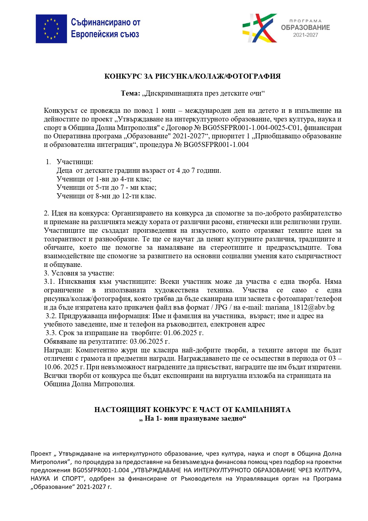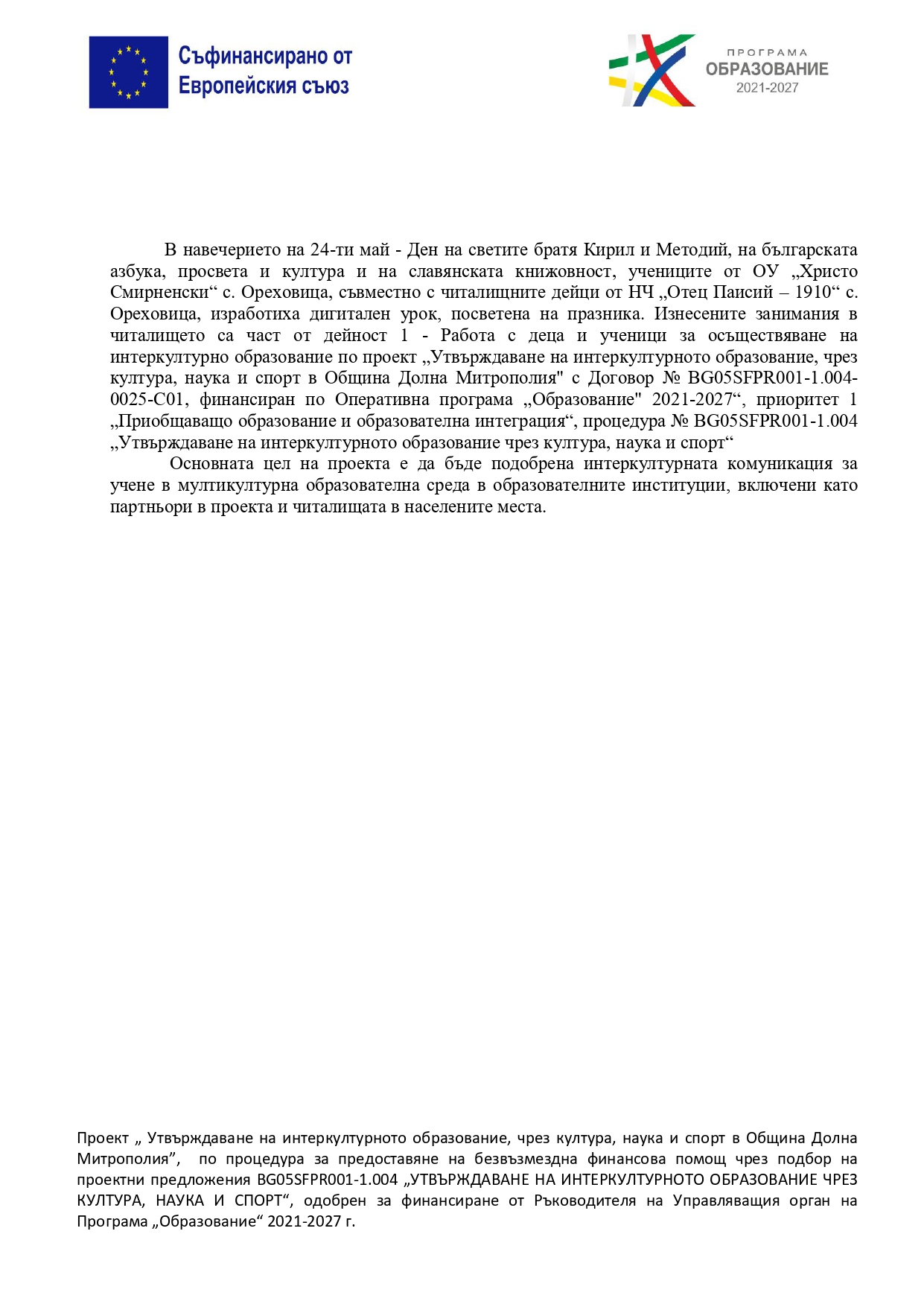Проект   Утвърждаване на интеркултурното образование, чрез култура, наука и спорт в Община Долна Митрополия" с Договор № BG05SFPR001-1.004-0025-C01, финансиран по Оперативна програма „Образование" 2021-2027“, приоритет 1 „Приобщаващо образование и образователна интеграция“, процедура №BG05SFPR001-1.004 „Утвърждаване на интеркултурното образование чрез култура,наука и спорт“.