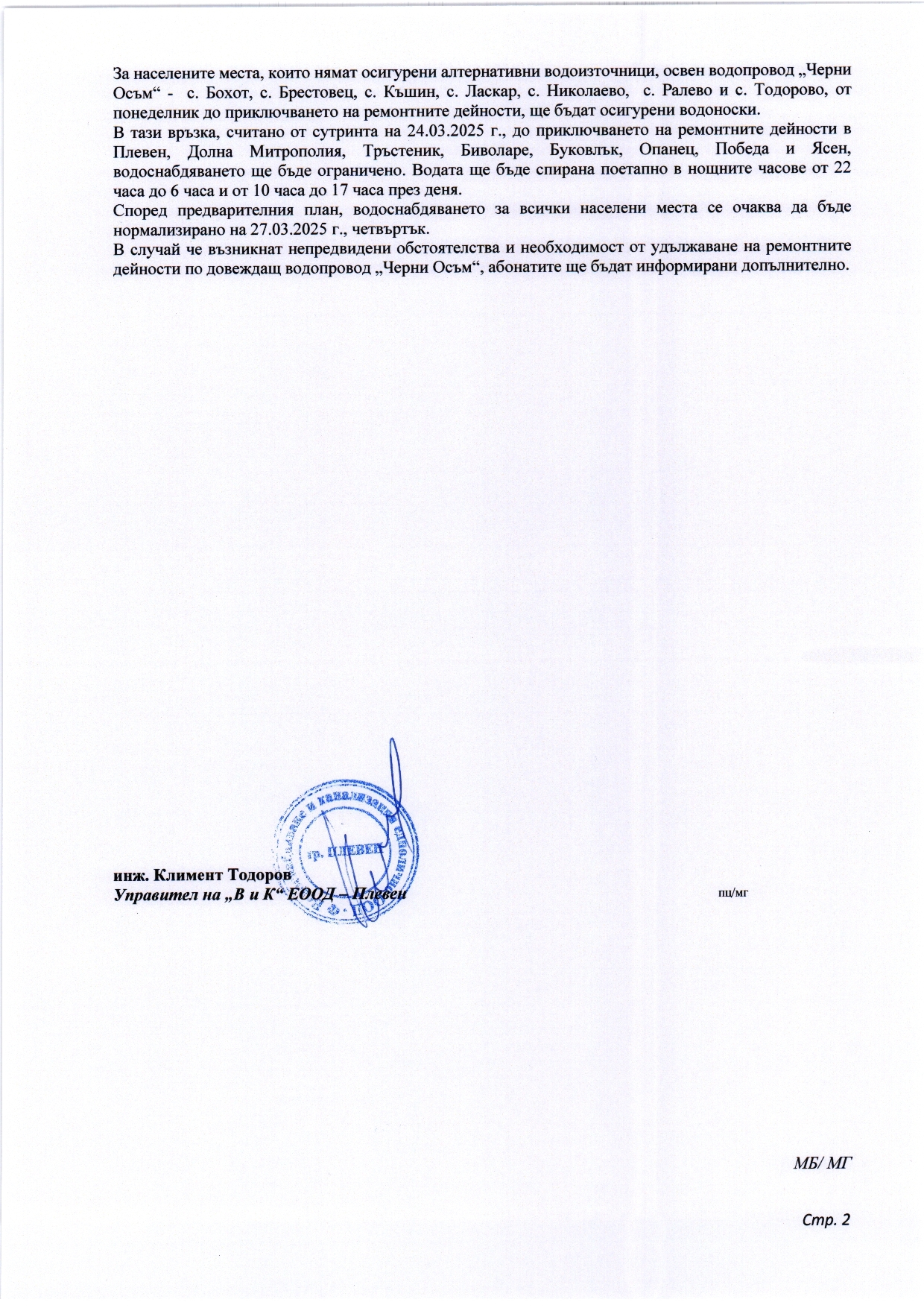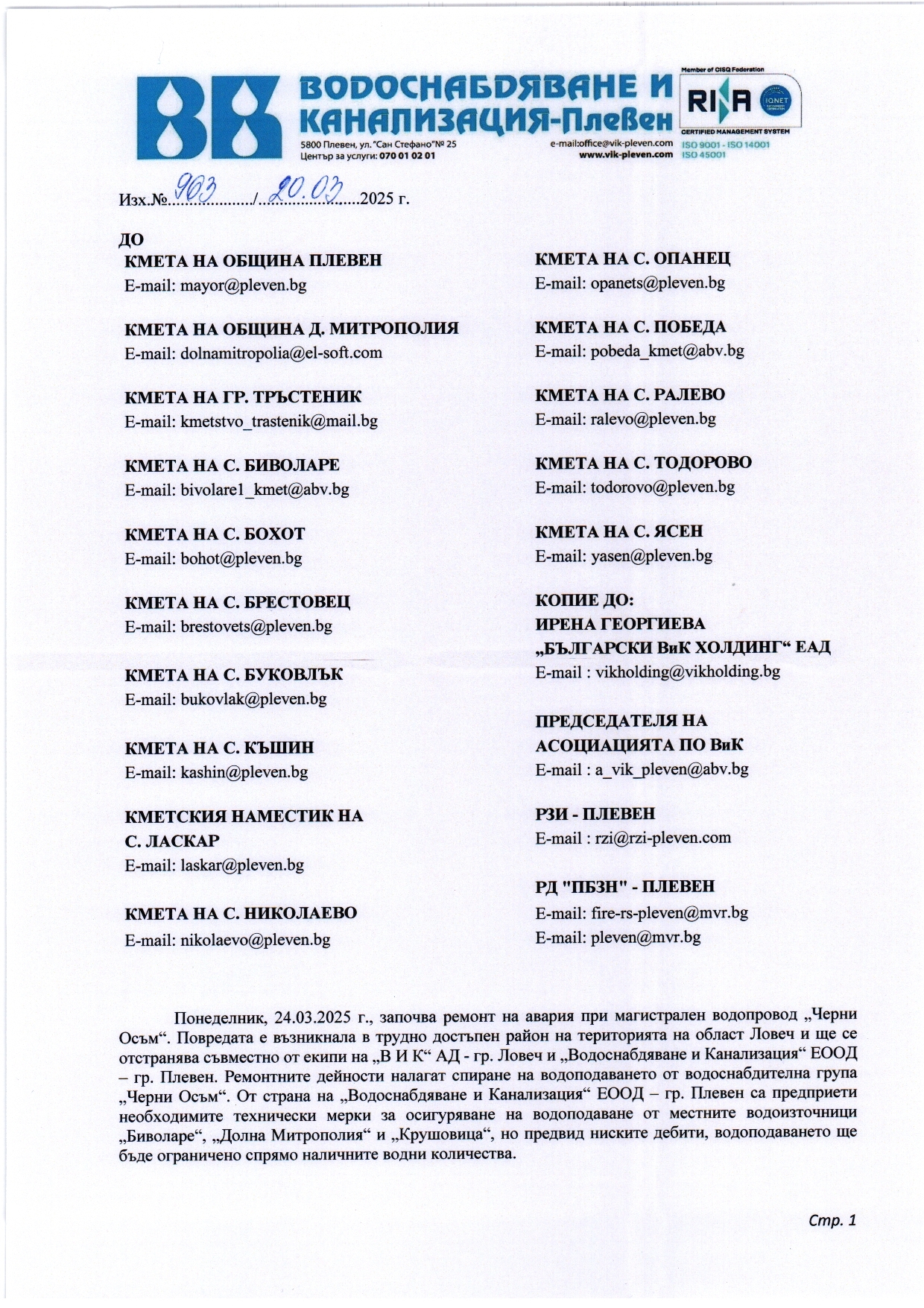 Съобщение във връзка с предстоящи прекъсвания на водоснабдяването на територията на Община Долна Митрополия