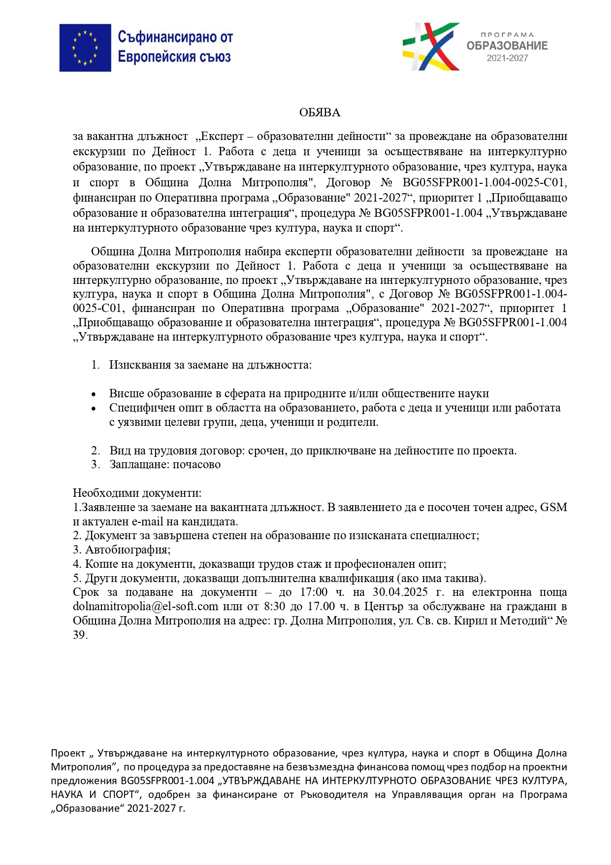 „Експерт – образователни дейности“ за провеждане на образователни екскурзии по Дейност 1. Работа с деца и ученици за осъществяване на интеркултурно образование, по проект „Утвърждаване на интеркултурното образование, чрез култура, наука и спорт в Община Долна Митрополия", Договор № BG05SFPR001-1.004-0025-C01, финансиран по Оперативна програма „Образование" 2021-2027“, приоритет 1 „Приобщаващо образование и образователна интеграция“, процедура № BG05SFPR001-1.004 „Утвърждаване на интеркултурното образование чрез култура, наука и спорт“.