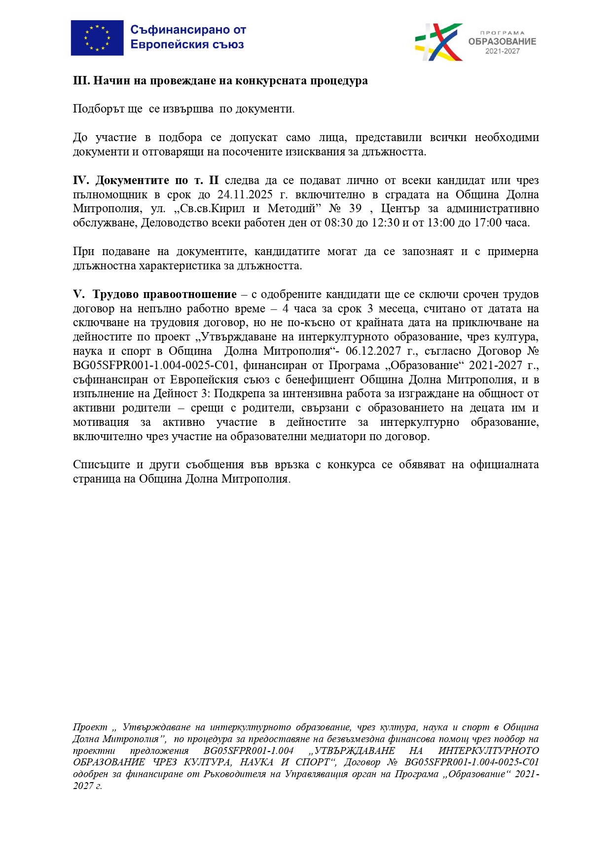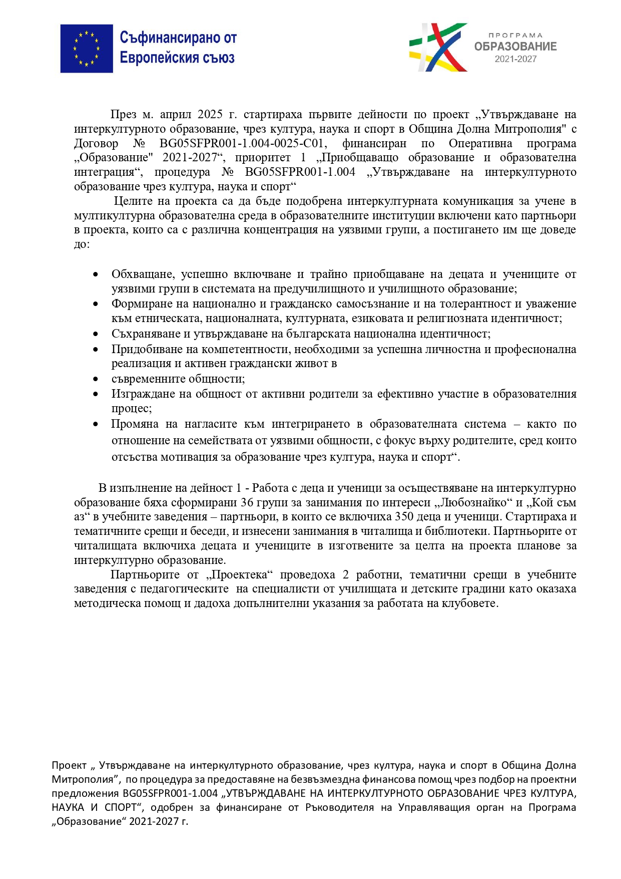 Проект „Утвърждаване на интеркултурното образование, чрез култура, наука и спорт в Община Долна Митрополия" с Договор № BG05SFPR001-1.004-0025-C01, финансиран по Оперативна програма „Образование" 2021-2027“, приоритет 1 „Приобщаващо образование и образователна интеграция“, процедура №BG05SFPR001-1.004 „Утвърждаване на интеркултурното образование чрез култура,наука и спорт“.