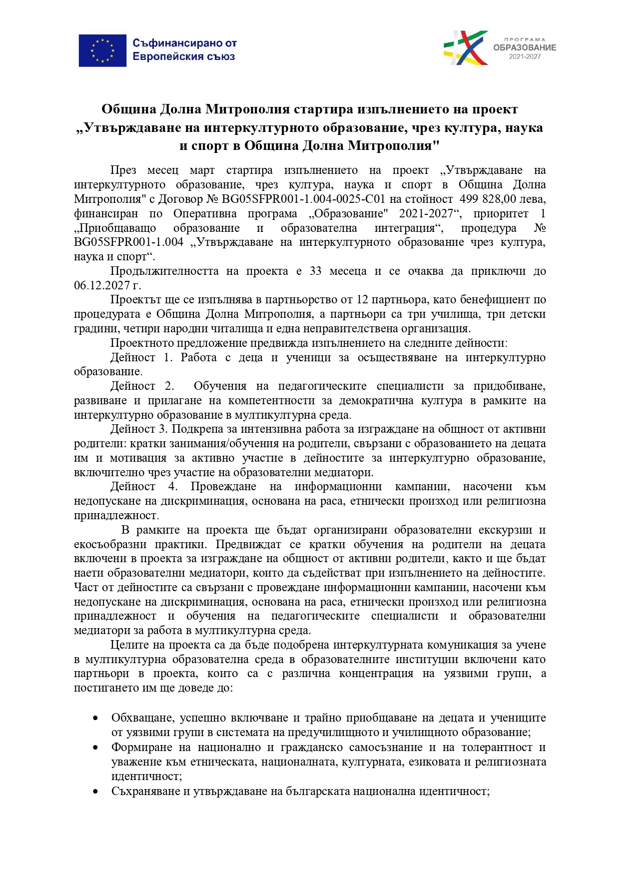 Проект „Утвърждаване на интеркултурното образование, чрез култура, наука и спорт в Община Долна Митрополия" с Договор № BG05SFPR001-1.004-0025-C01, финансиран по Оперативна програма „Образование" 2021-2027“, приоритет 1 „Приобщаващо образование и образователна интеграция“, процедура №BG05SFPR001-1.004 „Утвърждаване на интеркултурното образование чрез култура,наука и спорт“.