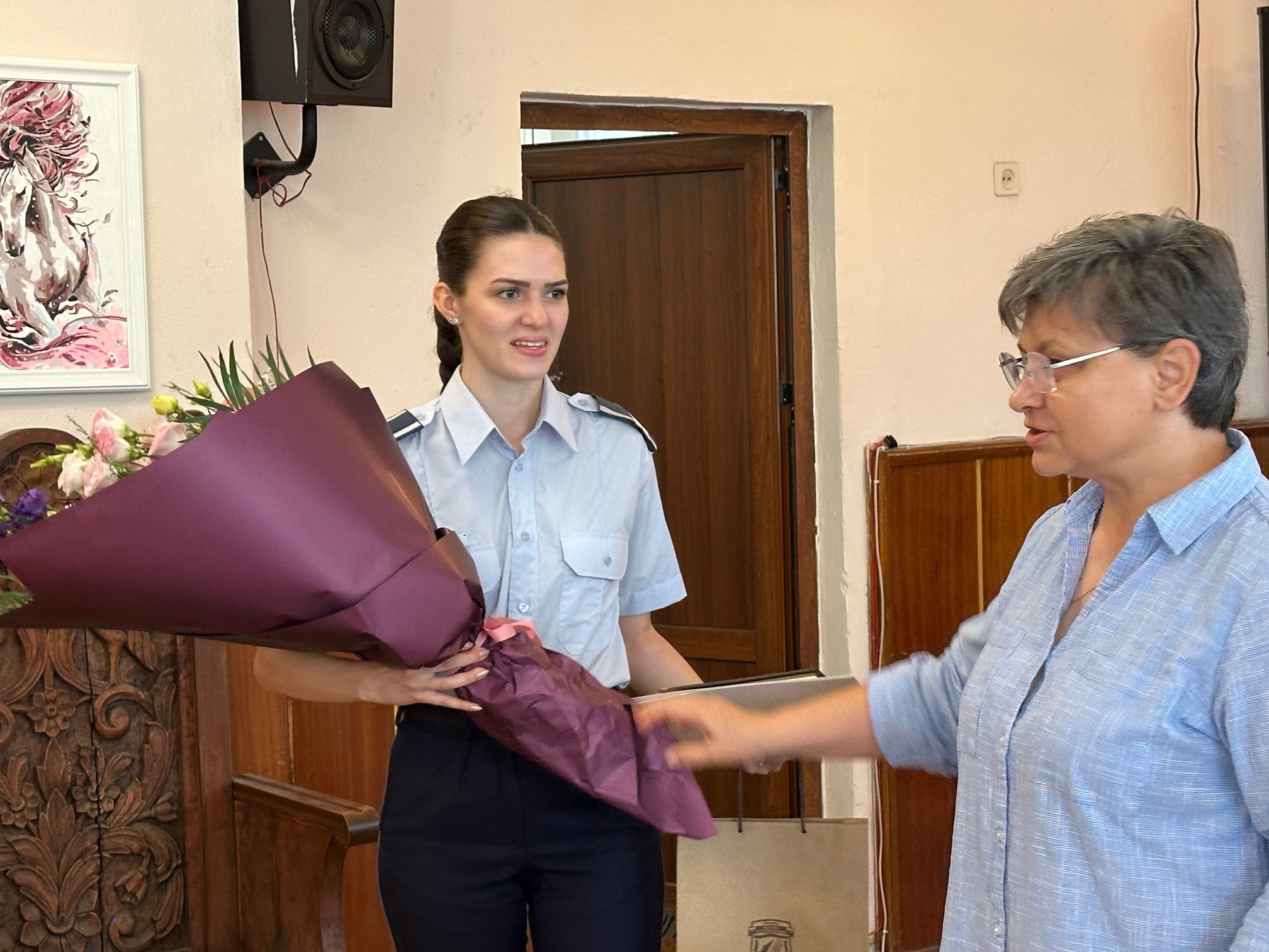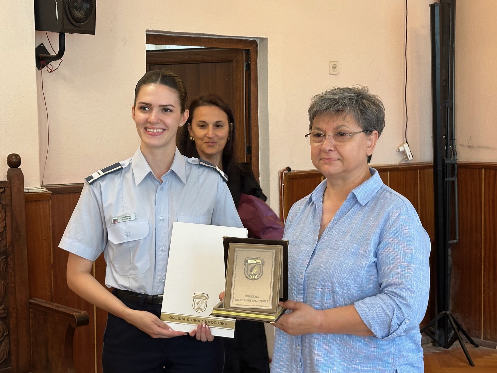 С гордост и пожелания за бъдещи успехи, увереност в работата и никога да не забравя Долна Митрополия, г-жа Поля Цоновска, Кмет на община Долна Митрополия, връчи наградата за 2025 година на курсант старшина Радина Иванова Бодурова, отличник на випуск 2025 г., специалност „Ръководител полети“.